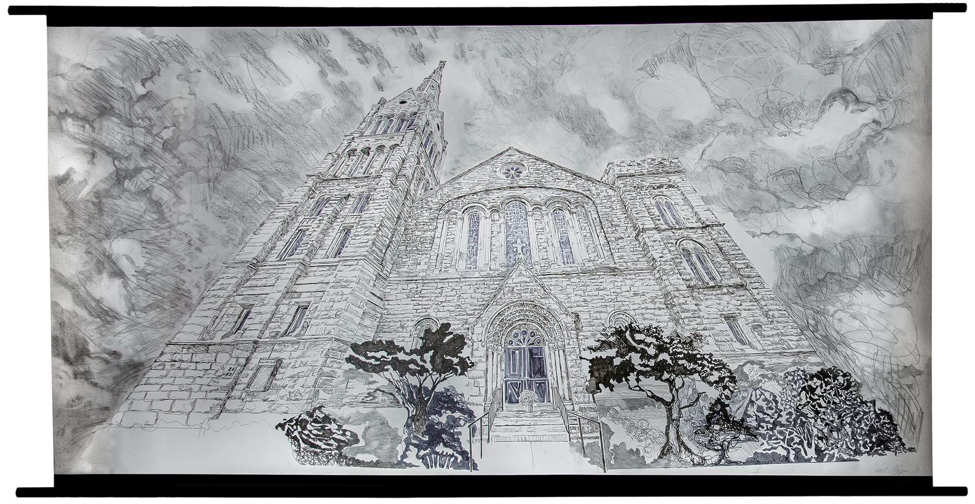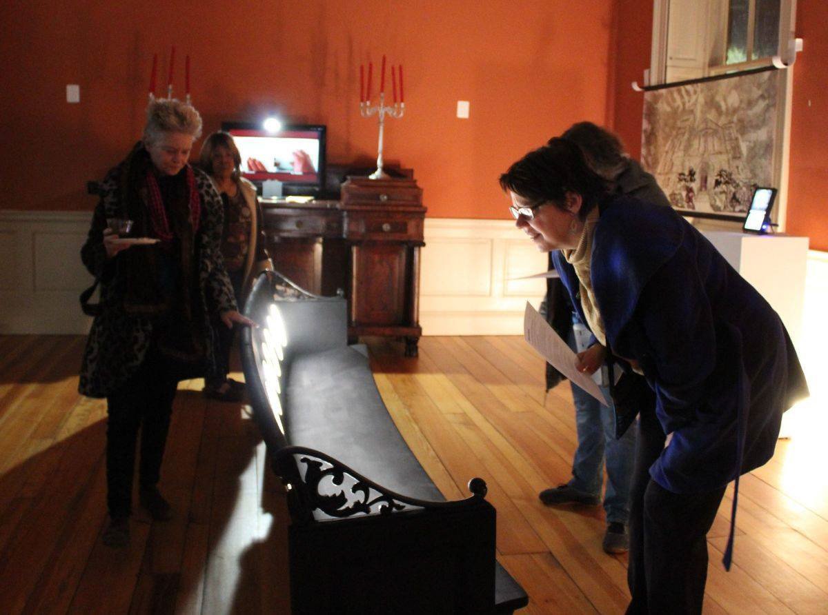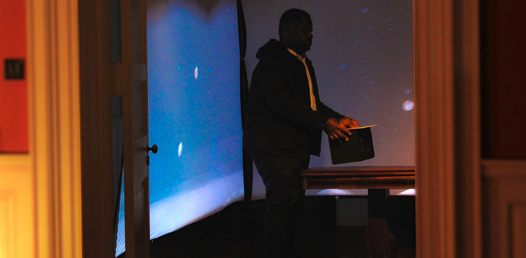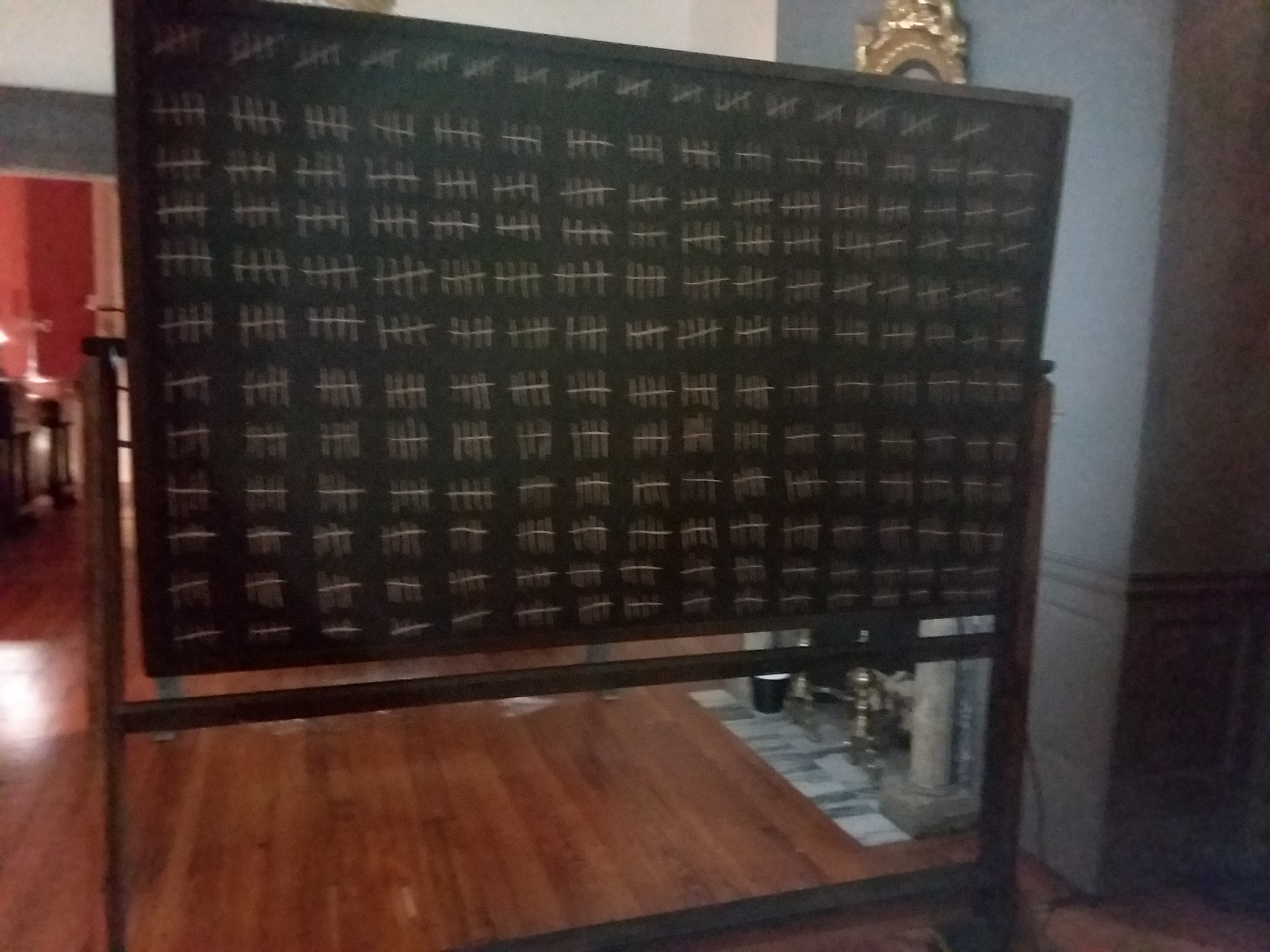 A chalkboard with a backlit whiteboard on the reverse side, this piece acknowledges the origins of the display space. Charles Carroll presided over his manor in Maryland; a 10,000 acre estate that included approximately 1,000 African slaves. At the time of his death, his 130 remaining slaves were valued at $5 each.